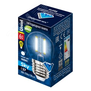 "Серия Sky — это серия светодиодных ламп с нитиевым излучателем, который обеспечивает очень ровное свечение лампы. Лампы серии Sky похожи на стандартные лампы накаливания и рекомендуются для общего освещения помещения, а также для использования в декоративных светильниках. Особенности строение лампы Sky -    1. Сапфировая подложка.    2. Люминофор.    3. Светодиоды. Светодиодные лампы серии Sky позволяют экономить до 90% электроэнергии по сравнению с обычными лампами накаливания, но при этом не теряя в качестве света. Так, например, лампа мощностью 7Вт заменит обычную лампу накаливания мощностью 60Вт. Лампа светодиодная LED-G45-6W/NW/E27/CL PLS02WH является аналогом 75 Вт лампы накаливания. Лампа имеет матовую колбу формы ""А"" и стандартный цоколь Е27. Цвет свечения - нейтральный белый. Упаковка - картон."