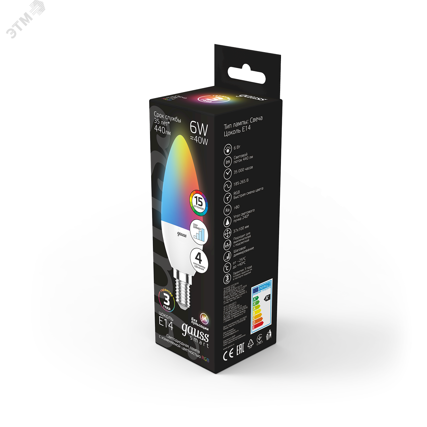 Лампа светодиодная LED 6 Вт RGB Вт+димирование E14 Свеча Black