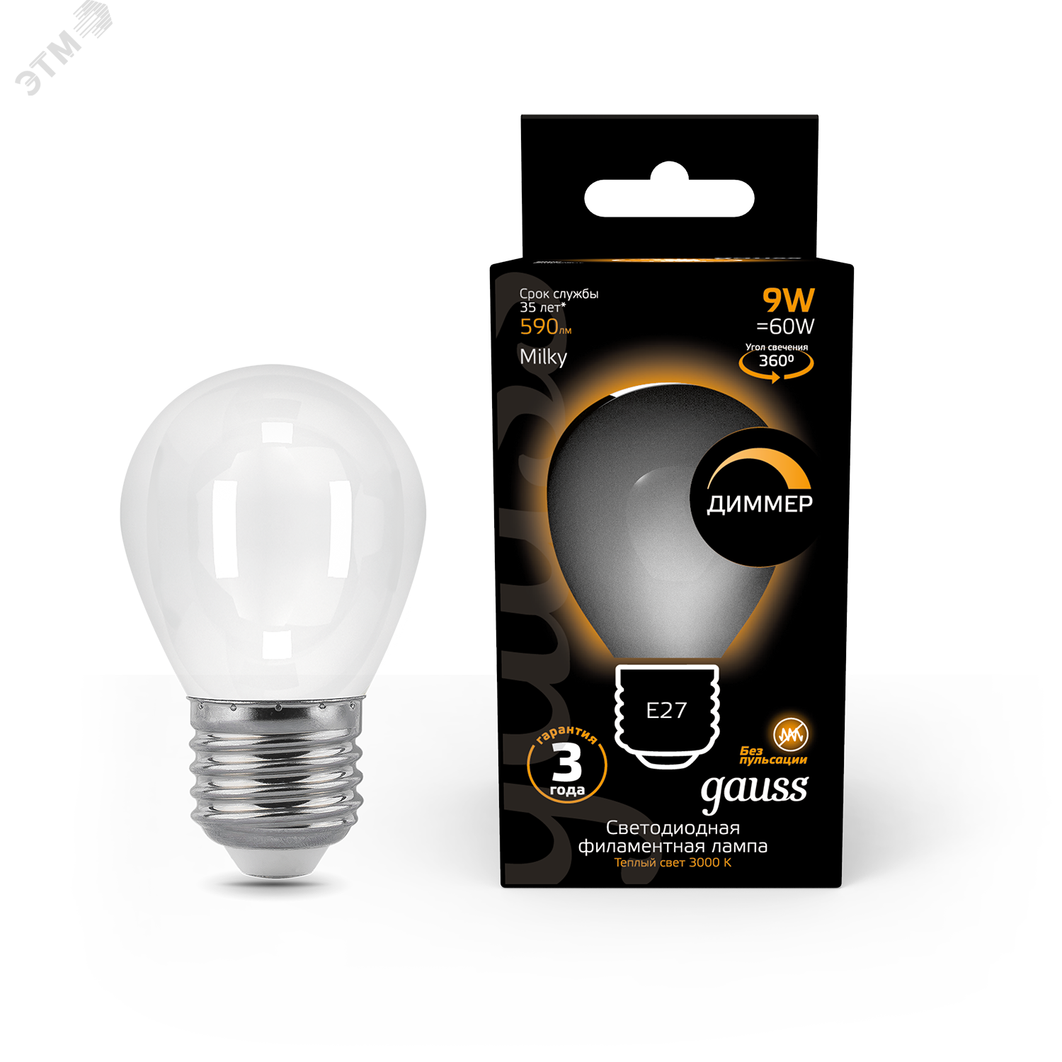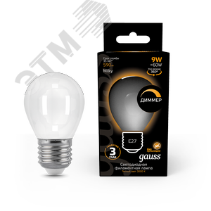 Лампа светодиодная филаментная LED 9 Вт 590 лм 3000К AC185-265В E27 шар P45 теплая матовая колба диммируемая Black Filament