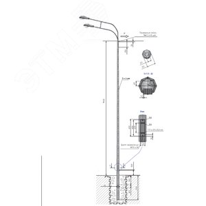 Для подвеса СИП (самонесущий изолированный провод). Предусмотрено отверстие для воздушного подвода питания, точка заземления выполняется на расстоянии 900–1 000 мм ниже верхнего обреза опоры. Арматура для СИП поставляется отдельно. В лючке предусмотрена планка для установки комплектующих и точка заземления (болт М10). Возможен подвод кабелей через окно в подземной части опоры. Установка осуществляется в подготовленный котлован. После установки опор по уровню их подземная часть заливается бетоном. Требуемая прочность обеспечивается при заливке бетоном до уровня, расположенного выше верхнего края окна ввода кабеля на размер Dн. Расчёт параметров фундамента производится исходя из климатических условий, ветрового района и параметров грунта. Для расчёта необходима услуга проектной организации. Комплект поставки - опора, болты М10/М12 (зависит от модификации) с контргайками 8 шт.