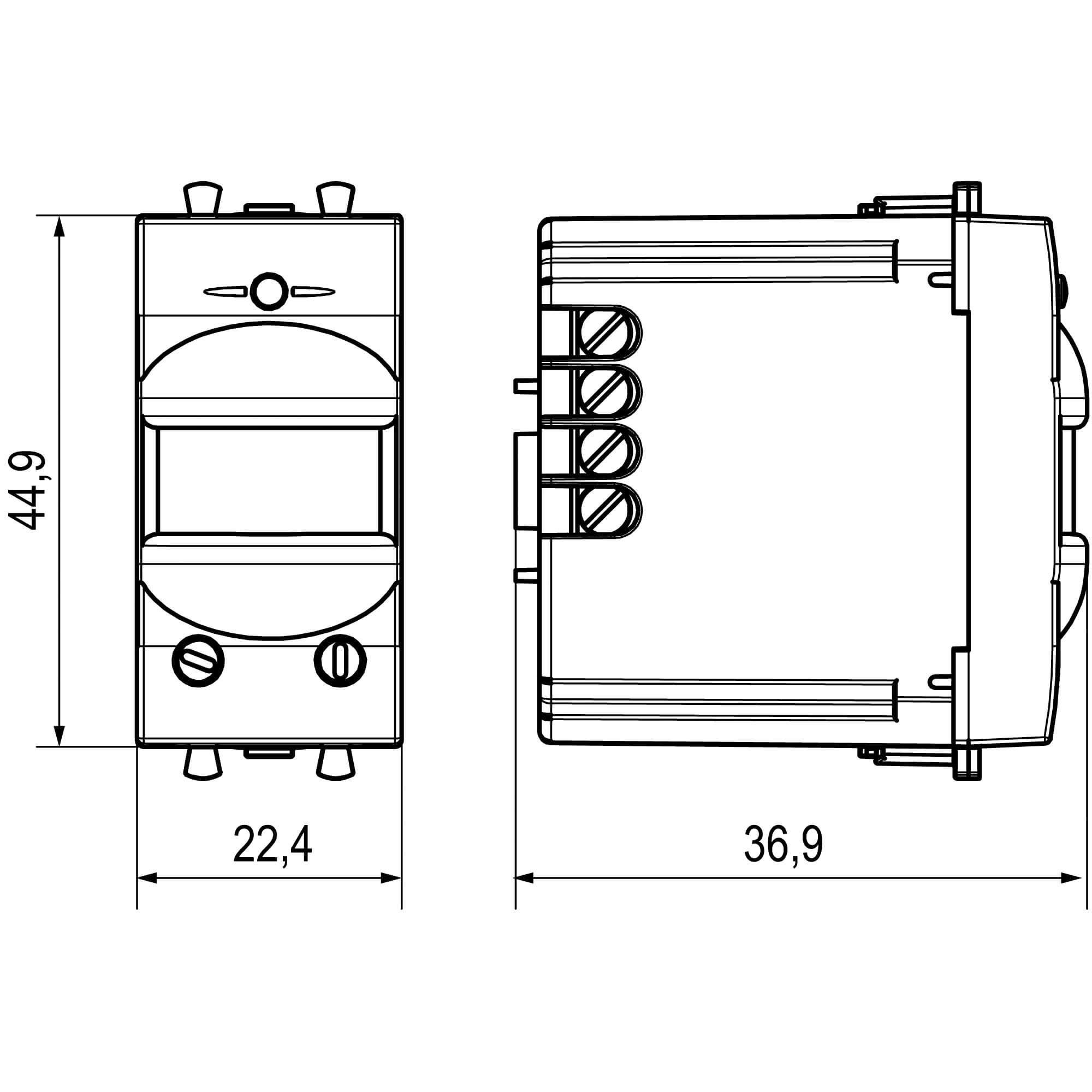 Датчик движения модульный. Назначение: для монтажа в систему кабельных коробов "In-liner Front" и систему организации рабочих мест "Sotto" при помощи рамок-суппортов и каркасов "Avanti" (код 4400912 и т.д.); автоматическое включение/выключение света. Характеристики: диаметр отверстий для ввода кабелей – 3 мм; винтовые зажимы; шаблон для зачистки кабеля – 11 мм; расстояние обнаружения – от 2 до 12 м угол охвата – 150°; время задержки отключения (от 10 с до 7 мин.); настройка светочувствительности датчика; настройка порога освещенности; фиксация в подрозеточные коробки глубиной не менее 45 мм при помощи каркаса с лапками (код 4400802) и саморезов. Кол-во модулей: 1. Цвет: "Закаленная сталь" Производитель оставляет за собой право вносить во внешний вид изделия изменения, которые не влияют на его функционал, безопасность и надежность.