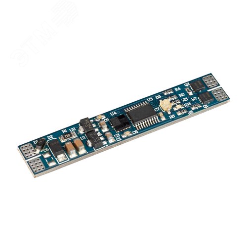 Сенсорный диммер SR-RULE-DIM-SENS (12-24V, 1x8A, 55x10mm) предназначен для управления яркостью одноцветных светодиодных лент, напряжением 12/24 В и мощностью до 96/192 Вт. Благодаря микро размерам платы 55*10*4,5 мм диммер устанавливается в алюминиевый профиль высотой от 7 до 50 мм под пластиковым экраном, что делает его незаметным, позволяя легко и быстро управлять освещением. Реагирует на движение рукой перед экраном в месте установки. Короткое касание включает/выключает освещение, долгое касание – плавно диммирует (изменяет яркость от 3-100 процентов). Имеется функция памяти последней настройки. Применяется только внутри помещений, поскольку плата открыта и не имеет корпуса. Отличное решение по управлению освещением небольших линейных светильников на основе профиля, применяемых для подсветки в шкафах, стеллажах, под полками в зоне кухни и др. местах.