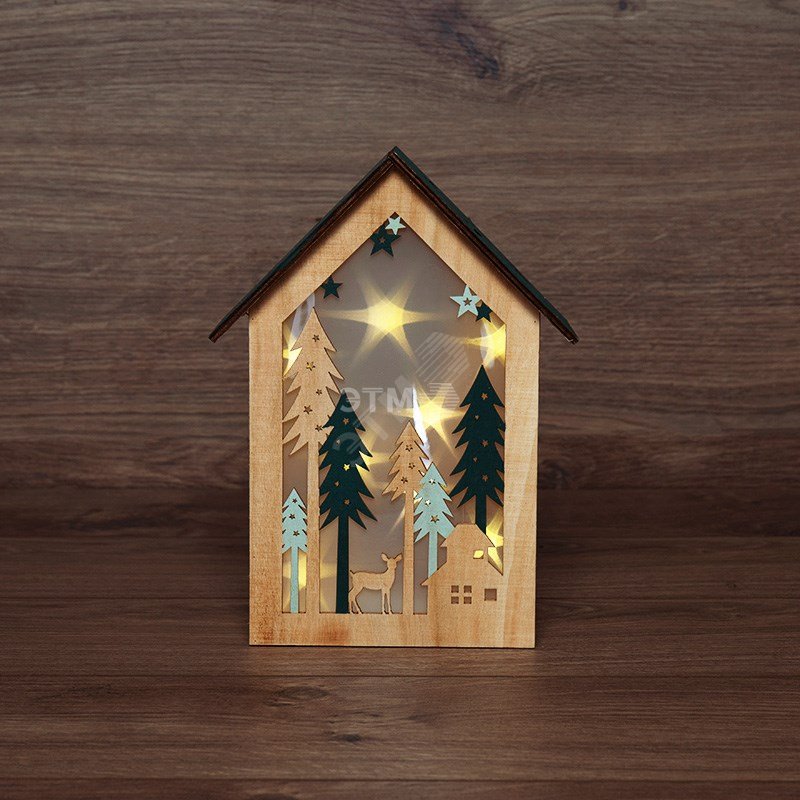 Деревянная фигурка с подсветкой ''Домик в лесу'' 19?6?26 см — необычный интерьерный декор, выполненный из экологичных безопасных материалов – натуральной древесины и нетоксичных красителей. В резном корпусе в виде домика с крышей находятся фигурки елей и маленького олененка, гуляющего в лесу. Композиция подсвечивается шестью диодами, излучающими теплый белый свет. Изделие работает от двух батареек типа ААА, что делает его мобильным. Деревянная фигурка с подсветкой станет оригинальным украшением вашего дома, создаст атмосферу уюта и тепла в долгие зимние вечера.