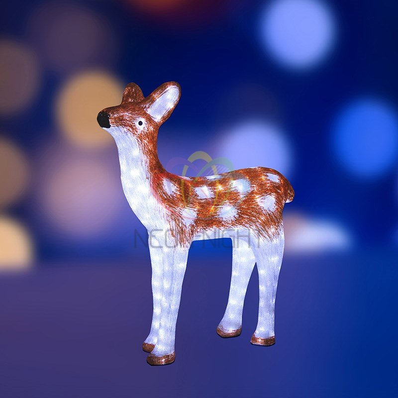 Эти яркие, светящиеся объемные фигуры, состоящие из металлического каркаса, акрила и светодиодов, применяются для оформления и создания новогодней атмосферы в кафе, ресторанах, торговых центрах, магазинах, на площадях и перед входом, а также просто в частных домах и квартирах. Все фигуры укомплектованы понижающим трансформатором , что обеспечивает безопасность при контактировании, а так же имеют степень защиты IP 65, что позволяет использовать их как в помещении, так и на улице. Акриловая светодиодная фигура ''Олененок коричневый'' высотой 81 см, светящаяся более чем 880 ярких диодов, выполнена по специальной технологии нанесения акрила имитируя шерстяной покров реального животного. Можно создать более интересную композицию и сделать праздник еще ярче, если составить всю семью коричневых оленей вместе (''Олень мама коричневая'' артикул 513-104 и ''Олень папа коричневый'' 513-105)