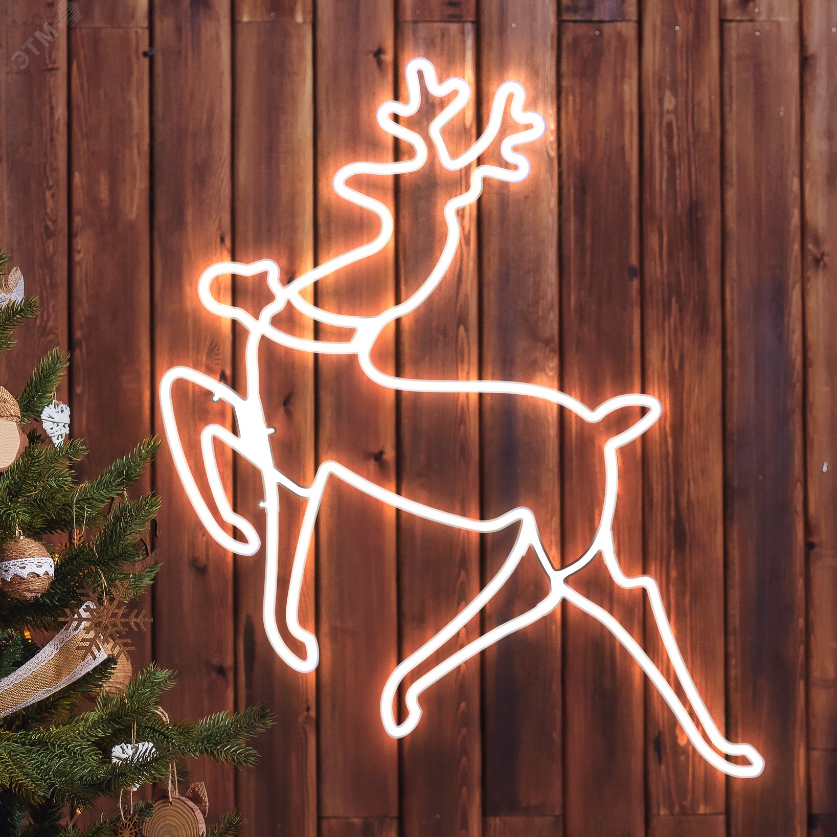 Светильник новогодний светодиодный ENIOF-14 Неоновый Олень от компании ЭРА размером 64 х 60 см станет необычным украшением Вашего дома! Фигура состоит из 480 светодиодных лампочек, которые помещены в трубки из ПВХ получается необычная имитация неона. Светильник повторяет очертания рождественского оленя, выглядит лаконично и впишется, пожалуй, в любой интерьер. Такой новогодний декор для дома можно поместить на стену кухни, гостиной или спальни, чтобы он радовал Вас, создавая праздничное настроение. Данный светильник имеет класс защиты IP44, длина кабеля 1 м, питание 220 В. Олень станет прекрасным подарком близких на Новый год и Рождество.