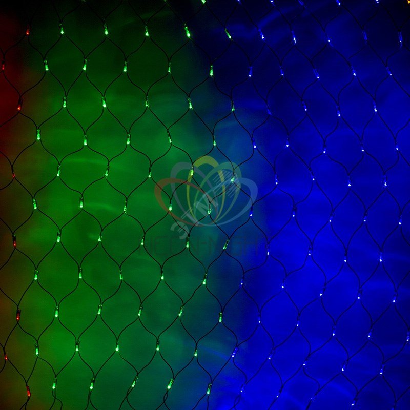 Гирлянда-сеть представляет из себя конструкцию в виде прямоугольника размером 2*1,5 метра, разбитого на равные ромбы, в углах которых находятся диоды красного, зеленого и синего цвета (RGB), причем диоды чередуются через один. Гирлянда имеет степень влагозащиты IP44 и ПВХ провод черного цвета, что позволит вам быстро и выгодно решить вопрос с декоративным украшением любых объектов как внутри помещения, так и снаружи. В комплекте идет контроллер с 8 режимами свечения, что позволяет гирлянде работать в динамике. Данная гирлянда используется для украшения фасадов и потолков зданий практически любой площади, отлично подходит для украшения небольших кустов, растяжки между направляющими в беседке или веранде, ей можно легко и быстро обмотать колонны или столбы, служит красивым декором окон зданий.