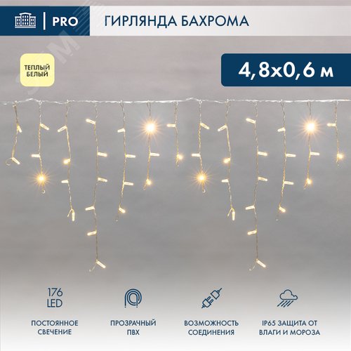 Гирлянда ''Бахрома'' (''Айсикл'') представляет собой гибкий горизонтальный шнур-шину, к которому через определенные промежутки крепятся вертикальные нити разной длины со светодиодами. Она имитирует сосульки и может послужить эффектным и оригинальным решением при декорировании карнизов домов, арок, фасадов зданий, витрин магазинов, а также стать элементов декора внутренних интерьеров помещений. Благодаря использованюя в гирлянде светодиодов, ее отличительной особенностью является превосходная яркость и низкое энергопотрбление по сравнению с лампами накаливания. При длине 4,8 метра гибкая направляющая имеет 48 вертикальных нити от 20 до 60 см. Данная гирлянда предназначена для использования как внутри помещения, так и снаружи.