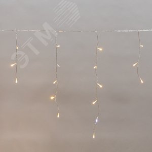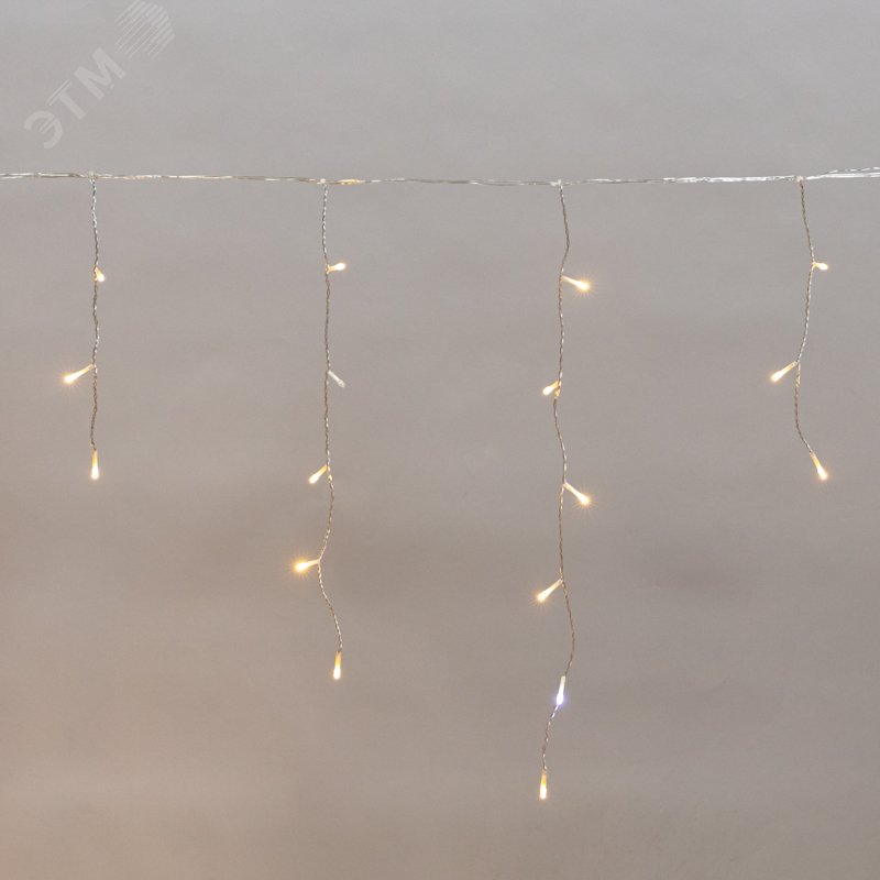 Светодиодная гирлянда Айсикл (Бахрома) представляет собой горизонтальный провод 25 м, на котором располагаются вертикальные нити разной длины от 30 до 60 см. Благодаря своей форме гирлянда оптимально подходит для оформления гардин, ниш, открытых проемов между комнатами, а также крыш, навесов, перил и других элементов зданий и ограждений. Степень защиты IP44 позволяет использовать гирлянду как на открытом воздухе под навесом, так и внутри помещений. На каждой нити располагаются светодиоды, создающие эффект сверкающих сосулек. Цвет свечения – теплый белый. Прозрачный провод изделия делает светящиеся линии более выразительными и образует гармоничную яркую композицию. Особенностью гирлянды является эффект мерцания, который добавляет динамики и создает магическую атмосферу.
