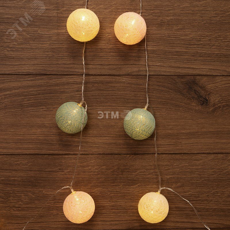 Тайские фонарики ''Перламутр'' — необычная светодиодная гирлянда длиной 3,5 метра, украшенная круглыми декоративными элементами в виде шариков, выполненных из хлопковой нити. Внутри каждого фонарика находится диод, излучающий теплый белый свет — всего в конструкции 20 диодов. Текстильный купол мягко рассеивает яркий поток, создавая уютное магическое свечение. Гирлянда, получающая питание от 2 батареек типа АА, поможет эффектно оформить карниз, гардину, спинку кровати, горшечное растение и любые другие интерьерные объекты, находящиеся вдали от розеток. Изделия на батарейках отлично подходят для украшения детских комнат благодаря безопасности использования.