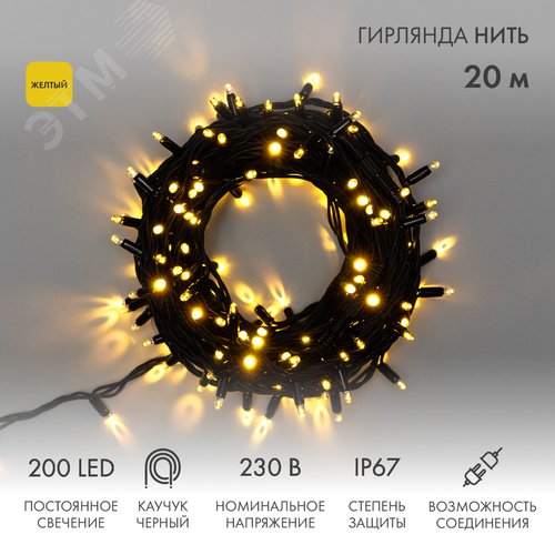 Светодиодную гирлянду Дюраплей Led изготавливают в виде эластичного кабеля со встроенными светодиодами с шагом ламп 10 см. Предусмотрена возможность последовательного подключения гирлянд. Максимальная длина гирлянды может достигать 300 м! Максимальное количество гирлянд подключаемых в одну цепь - 15. Эта ударопрочная и влагостойкая конструкция идеально подходит для применения на наружных объектах. Высокая степень современной влагозащиты дает возможность для использования гирлянды в сложных климатических условиях. Она нашла широкое применение при подсветке фасадов зданий, новогодних елок, ограждений, мостов, деревьев, арок, магазинов. Великолепно подходит для красочного оформления витрин. В данном комплекте 4 модуля по 5 м с желтым цветом свечения светодиодов.