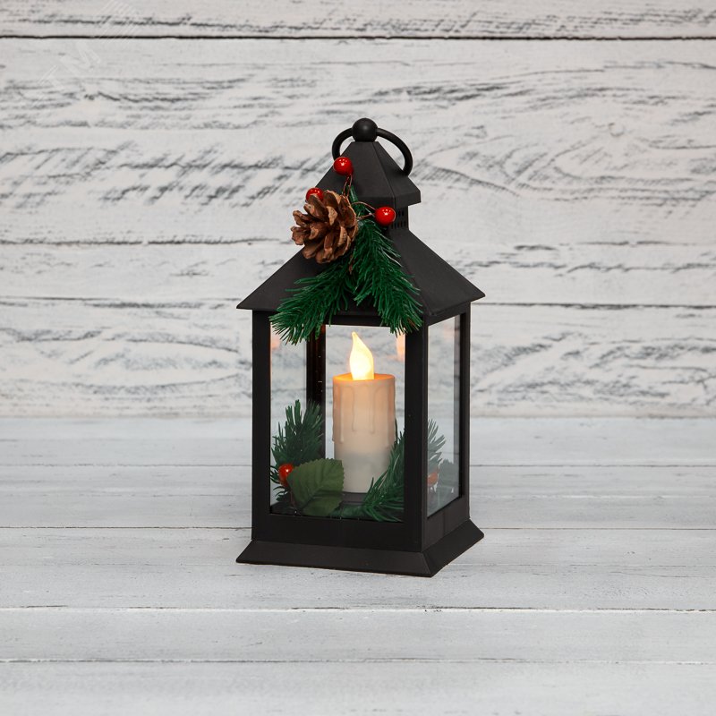 Фонарь декоративный со свечкой и шишкой, черный корпус, размер 10,7x10,7x23,5 см, тёплый белый