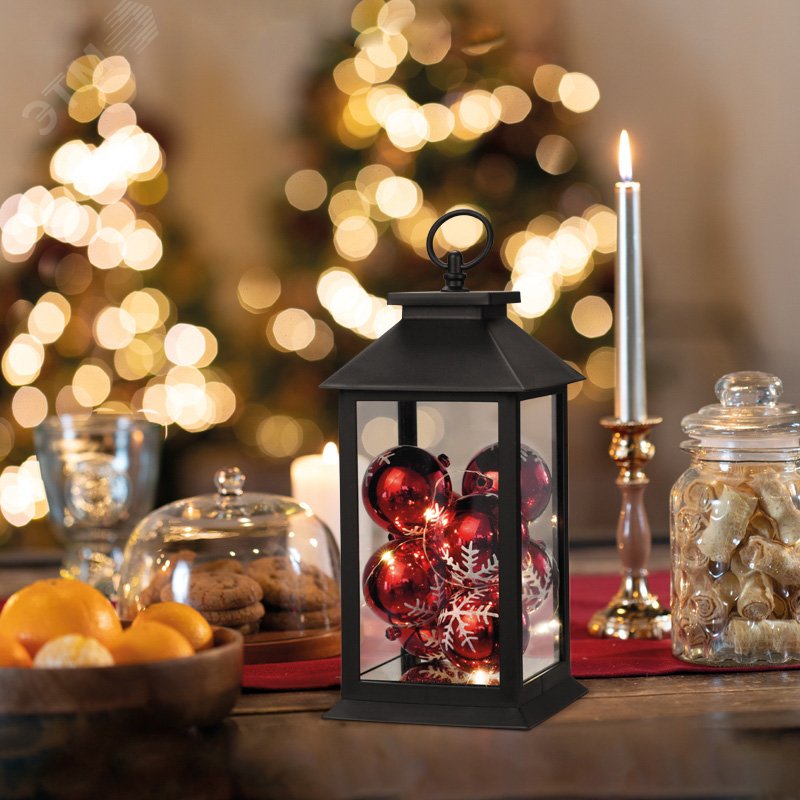 Фонарь декоративный с Шариками, черный корпус, размер 14х14х27 см, тёплый белый