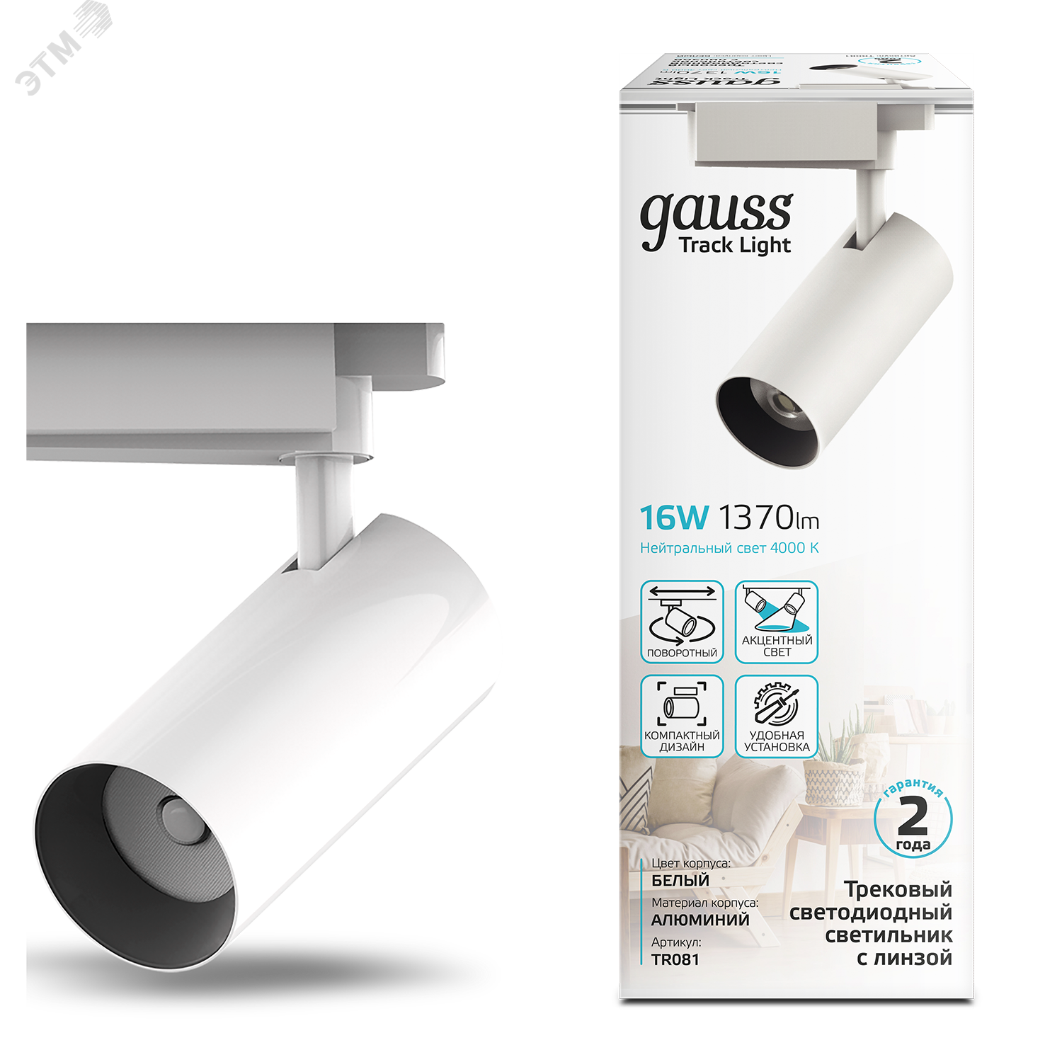 Светильник светодиодный трековый однофазный LED ДПО 16 Вт 1680 Лм 4000К IP20 d65х206 мм Track Gauss Gauss TR081