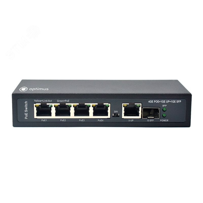 Коммутатор Optimus U1E-4G/1G/1S - неуправляемый PoE-коммутатор. Он оснащен 4 портами 10/100/1000 Мбит/с с поддержкой PoE. PoE-порты 1-4 соответствуют стандартам PoE IEEE802.3af/at. Каждый порт подает питание мощностью до 30 Вт на подключенное устройство. Это позволяет размещать оборудование в труднодоступных местах вне зависимости от расположения электрических розеток и минимизировать прокладку кабеля. Предусмотрены 2 Uplink-порта - RJ-45 и SPF со скоростью передачи данных до 1000 Мбит/с для подключения коммутатора к локальной сети, сети интернет, видеорегистратору или другому коммутатору. Поддерживает автоматическое определение MDI/MDIX на всех портах. Коммутатор распознает тип подключенного сетевого устройства и при необходимости меняет контакты передачи данных, что позволяет использовать кабели, обжатые любым способом (кроссовые и прямые). Коммутатор оснащен технологией Watchdog, которая позволяет автоматически контролировать зависания подключенных устройств.