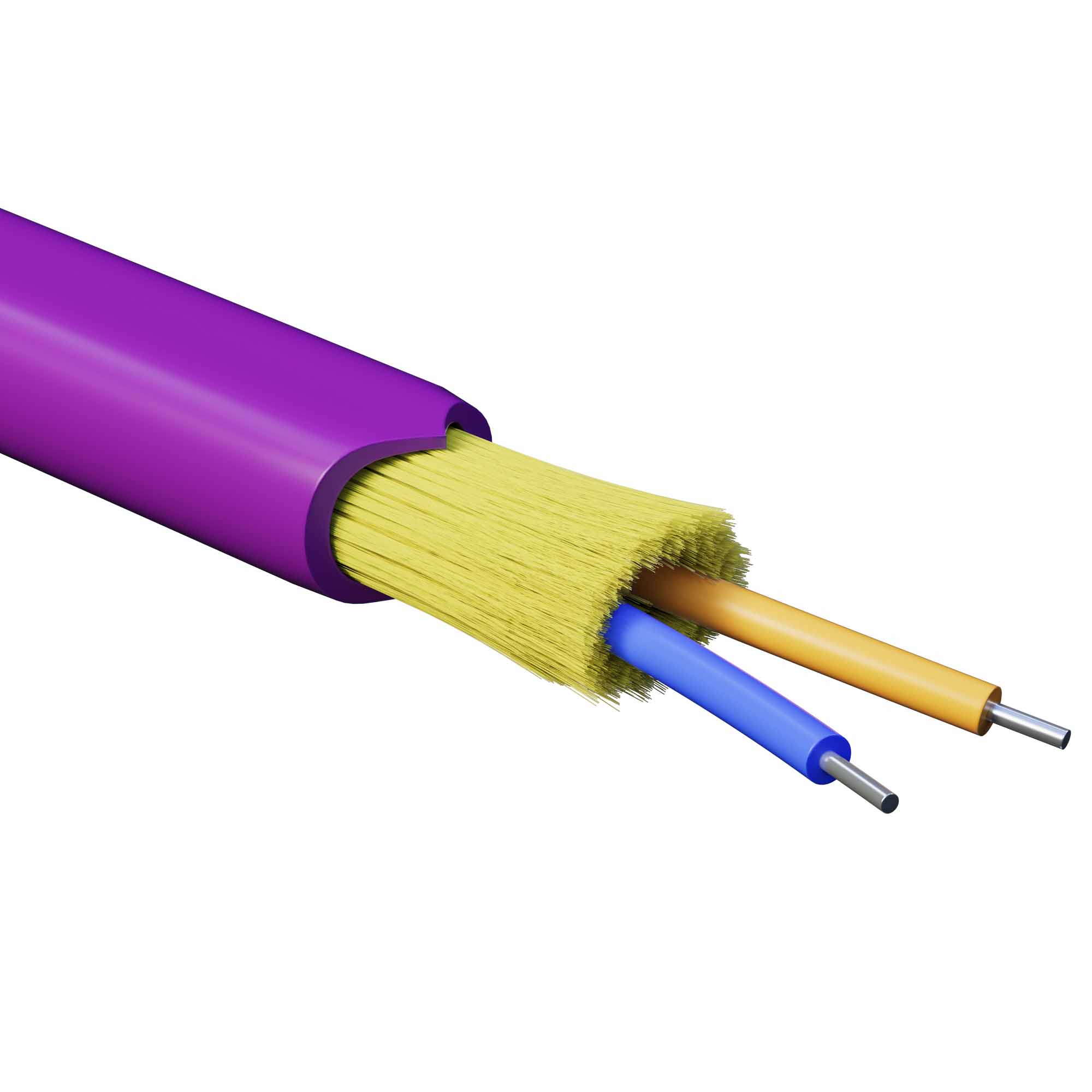 Кабель волоконно-оптический, распределительный, арамидные упрочняющие нити, для внутренней прокладки, нг(А)-HF, 2 ОВ, категория OM4 (G.651.1) плотный буфер, 0,4 кН, барабан 500 м