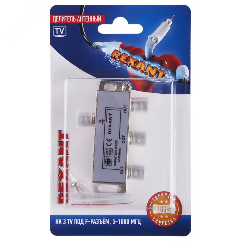 Делитель антенный предназначен для телевизионных систем и используется для подключения нескольких телевизионных аппаратов к одной антенне. Делитель распределяет поступающий сигнал поровну на его выходы, что обеспечивает одинаково четкое изображение на всех подключенных устройствах, подходит для сигналов с частотой 5-1000 МГц, что соответствует стандартному эфирному телевидению. Делитель имеет несколько выходов и подключается с помощью F-разъемов. Позволяет монтировать без пайки контактов, надежное соединение контактов, удобно и быстро подключение к ТВ-устройствам, не требует подключение к внешним устройствам.