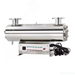 Установки обработки воды ультрафиолетом применяются в случаях, когда необходимо уничтожить или предотвратить размножение патогенной микрофлоры – дезинфицировать воду от бактерий, вирусов, плесени и водорослей. Источником ультрафиолетового излучения служит ультрафиолетовая лампа, устанавливаемая внутри установки герметично, которая стерилизует и обеззараживает воду. Обеззараживание воды нашло широкое применение в подготовке питьевой воды, пищевой промышленности, медицине, в фармацевтическом производстве. Локальные установки обеззараживания используются в конечных точках разбора питьевой воды. 120 gpm, 30 м.куб/час.