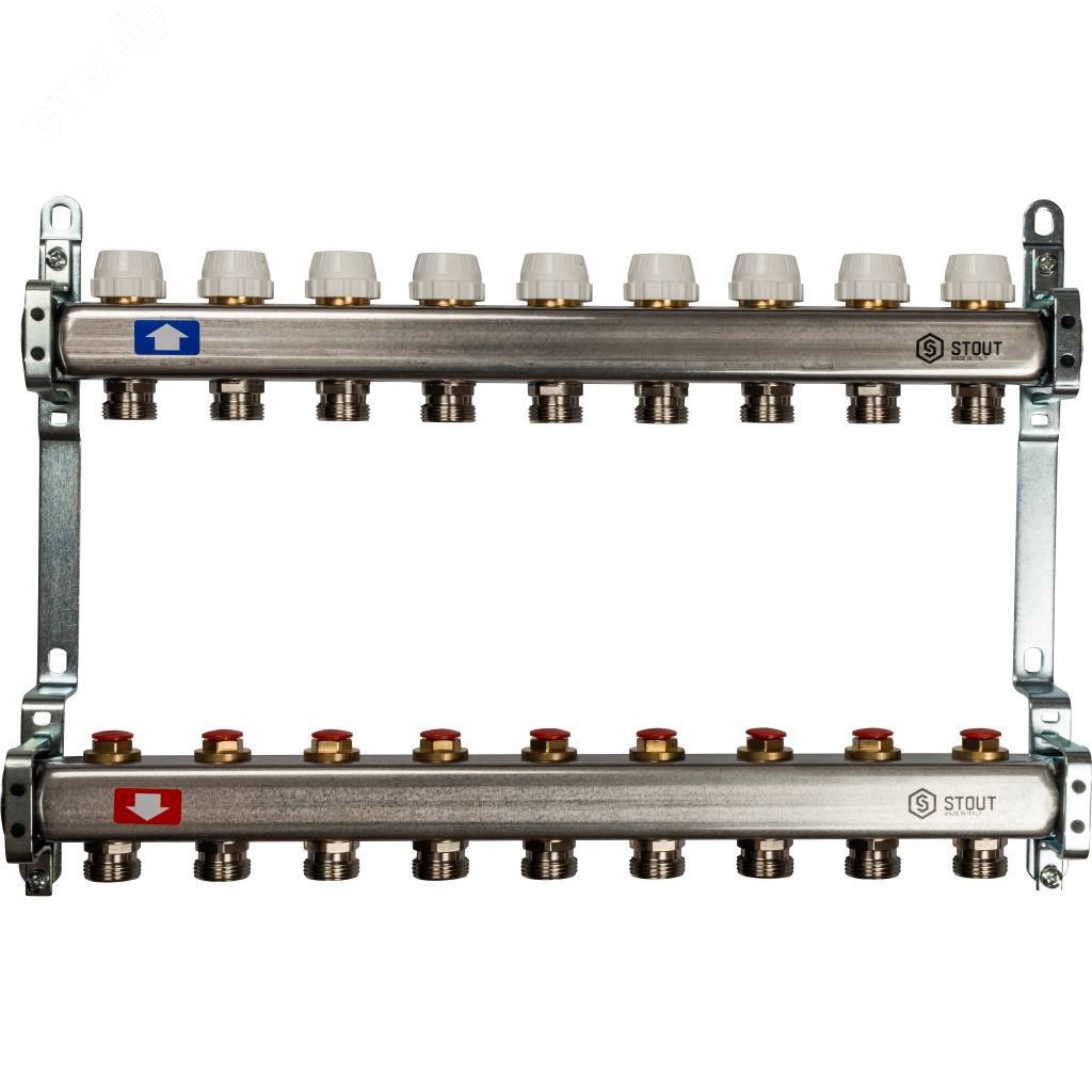 Блок коллекторный с ручными регулировочными клапанами 1' х 9 выходов 3/4' НР евроконус